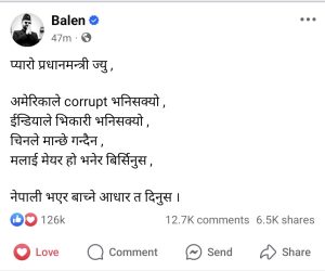 उनले लेखेका छन्, प्यारो प्रधानमम्त्रीज्यू, अमेरिकाले करप्ट (भ्रष्ट) भनिसक्यो, इन्डियाले भिखारी भनिसक्यो, चीनले मान्छे गन्दैन, मलाई मेयर हो भनेर बिर्सिनुस्, नेपाली भएर बाँच्ने आधार त दिनुस्।’