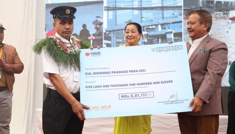 भाटभटेनीका सञ्चालक मीनबहादुर गुरुङले बुधबार सुरक्षागार्ड दुलप्रसाद पराजुलीलाई पाँच लाख एक हजार १११ रुपैयाँ नगद पुरस्कारसहित सम्मान गरेका हुन् । उनको पाँच ग्रेड बढुवा पनि गरिएको छ ।