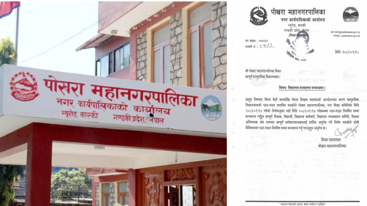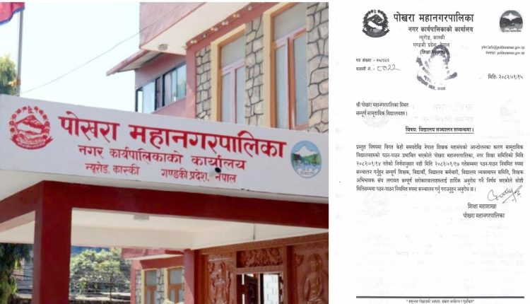 पोखरा महानगरपालिकाले सामुदायिक विद्यालयलाई वैशाख १७ गतेदेखि नियमित कक्षा सञ्चालन गर्न निर्देशन दिएको छ । नेपाल शिक्षक महासंघको आन्दोलनले सामुदायिक विद्यालयको पठनपाठन प्रभावित भएको भन्दै विद्यालय सञ्चालन गर्न सूचना जारी गरेको हो ।