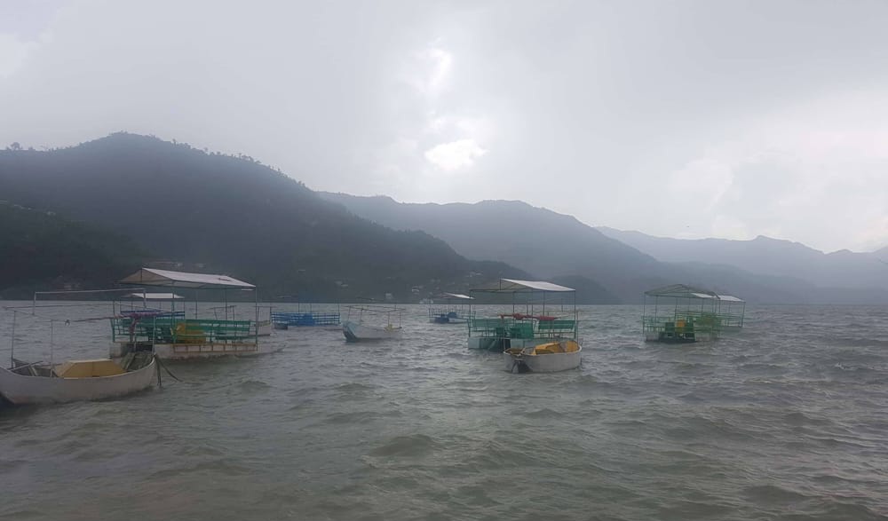पोखराको फेवा तालमा डुंगा चलाएर कायकिङ (एक्लै बसेर तालमा डुंगाबाट गरिने यात्रा) गरिरहेका केही व्यक्तिहरू अलपत्र परेका छन् ।